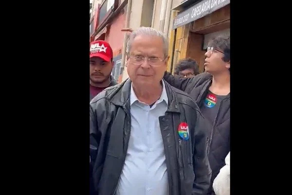 Nas imagens, Dirceu usa um adesivo de Lula, que disputa a eleição ao Palácio do Planalto, e caminha com um grupo de apoiadores, alguns deles usando bonés e camisetas do Movimento de Trabalhadores Sem Terra (MST).