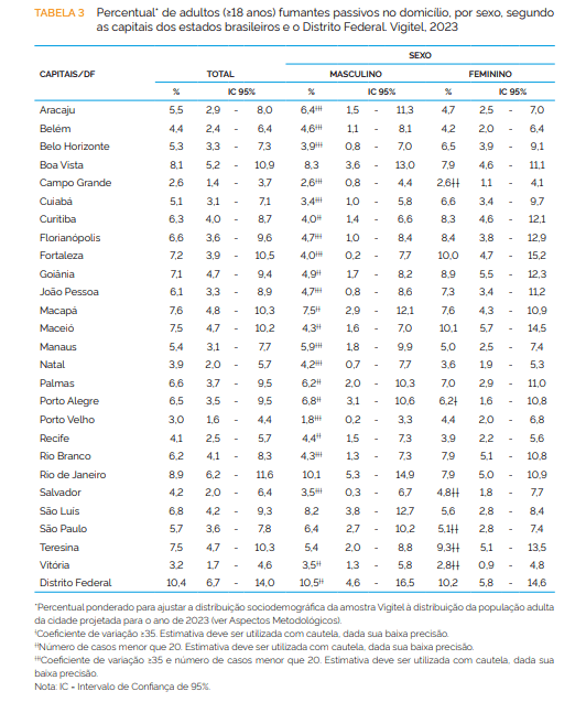 No conjunto das 27 cidades, a frequência de fumantes passivos no local de trabalho foi de 7,0%, sendo maior entre os homens (10,2%) do que entre as mulheres (4,3%). Com relação à frequência de fumantes, o Vigitel traz as estimativas sobre frequência e distribuição sociodemográfica de fatores de risco e proteção para doenças crônicas nas capitais dos 26 estados brasileiros e no Distrito Federal em 2023.