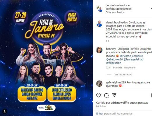 Como visto pelo ClickPB, a atração mais cara será Luan e Forró Estilizado, que vai custar R$ 100 mil. Já a cantora Walkíria Santos vai receber R$ 90 mil pela apresentação, conforme documentos encontrados pelo ClickPB em diários oficiais.