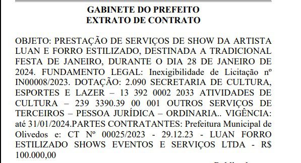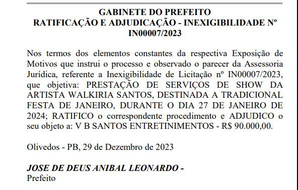 A Prefeitura de Olivedos, município do Curimataú paraibano, vai gastar R$ 190 mil com dois shows. As atrações vão se apresentar em praça pública para a ‘Festa de Janeiro’, evento tradicional da cidade.