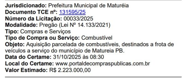 O certame ocorrerá no dia 31 de outubro, no Portal de Contas Públicas. Segundo o edital, “o objeto da presente licitação é a escolha da proposta mais vantajosa para Aquisição parcelada de combustíveis, destinados a frota de veículos a serviço do município de Matureia – PB”.