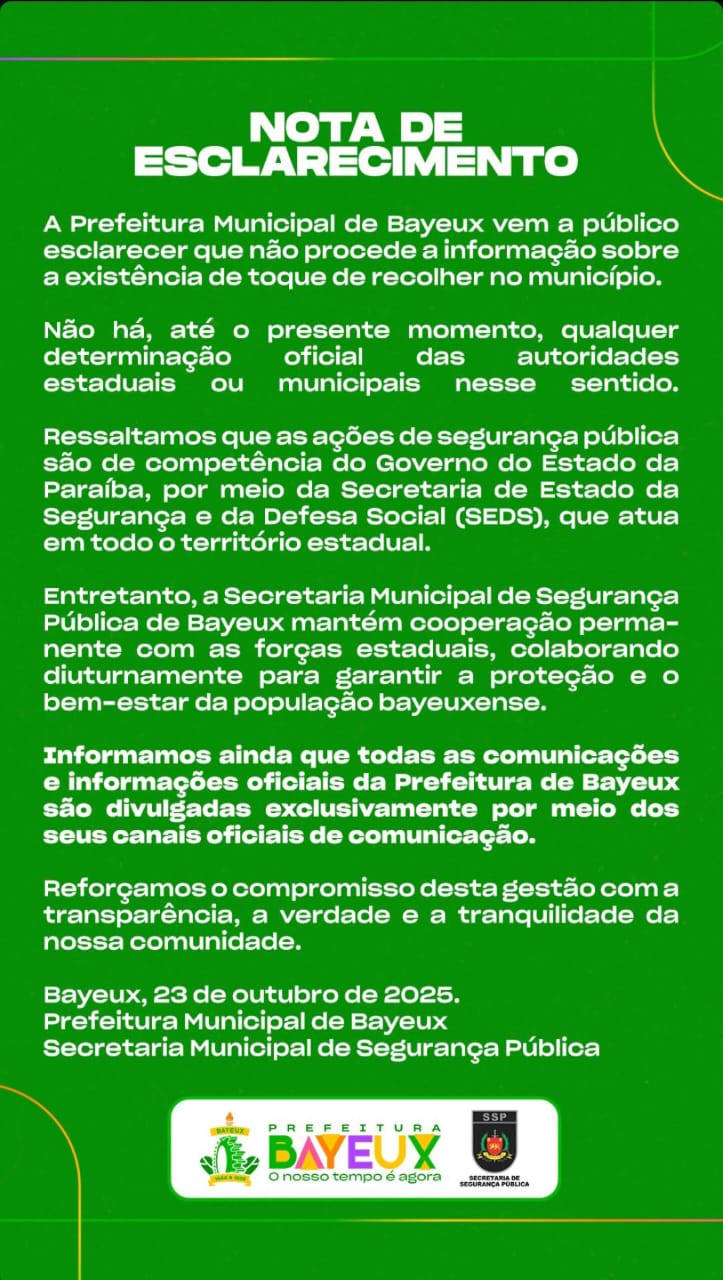 “Não procede a informação sobre a existência de toque de recolher em Bayeux”, diz o comunicado. Além disso, ressaltam que ações de segurança pública são de responsabilidade do Governo da Paraíba, por meio da Secretaria de Estado da Segurança e da Defesa Social (SEDS).