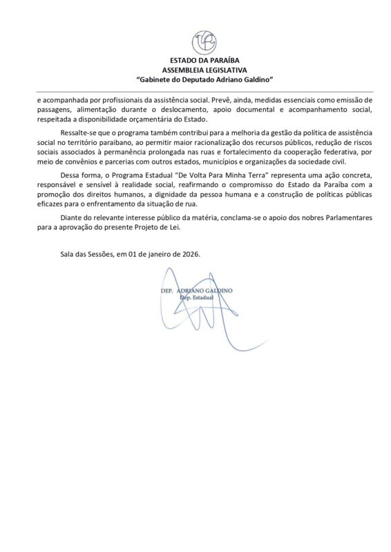 Na justificativa, Adriano Galdino afirmou que o fenômeno da população em situação de rua é complexo e multifatorial, envolvendo desemprego, rupturas familiares, dependência química, transtornos mentais, ausência de políticas públicas integradas e desigualdades sociais. Ele argumenta que parte significativa dessas pessoas, na Paraíba, é oriunda de outros estados e migrou sem rede de apoio local.
